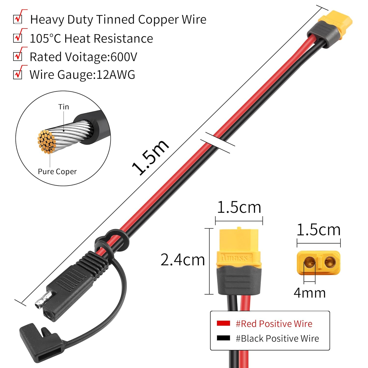 longueur 1,5 m, section 2x 3,3 mm², SAE à XT60, fil de cuivre étamé haute résistance, résistant à la chaleur 105°C, tension nominale : 600 V, calibre du fil 12AWG