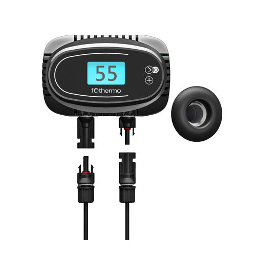 Ingresso FV 50 Voc / 23 A / 3000 W, potenza assorbita 1000 W, FV consigliato 1500...2500 W, intervallo di riscaldamento 10...65(85) °C, attacco G 1 1/2 Zoll. L'elemento riscaldante solare fothermo è un elemento riscaldante a corrente continua da 1.000 watt per la preparazione di acqua calda. Una funzione di surplus integrata consente di immettere la potenza in eccesso in un secondo elemento riscaldante solare o nella rete elettrica domestica tramite un inverter micro-FV. Ciò riduce i costi di acqua calda ed elettricità. L'elemento riscaldante solare utilizza un controllo di potenza variabile in continuo da 0 W a 1.000 W.